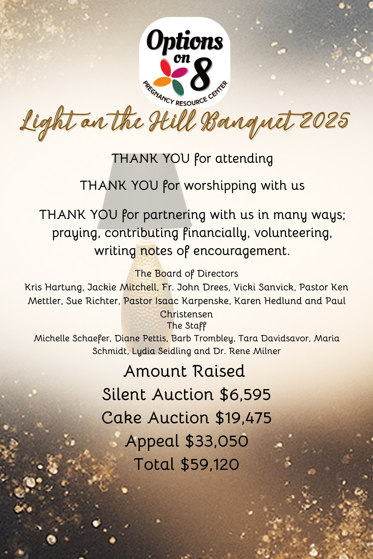 Our annual Baby Bottle Boomerang is our largest fundraiser. Many area churches participate, and we appreciate their ongoing support! Members of the congregation are asked to take a baby bottle home on Mother’s Day to fill with coins, bills, or checks and return it on Father’s Day. It is a fun activity for the whole family! A little change goes a long way in helping change lives. The bottles also are a visual reminder to pray for the ministry of Options on 8 Pregnancy Resource Center and the families they serve.